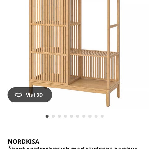 Åben garderobeskab i bambus med en enkelt skydelåge så den kan stå åben i begge sider. Købt i Ikea for ca 1 år siden. Stået på datters værelse imens hun har været på efterskole, så ikke meget brugt og i fin stand. Nypris 1800 kr.