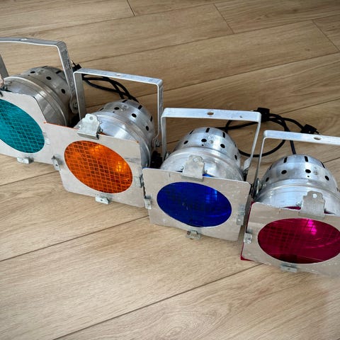 Fire fine PAR 56 lamper i kort model. Alle er udstyret med 300w halogenpære og nye farvefiltre. Giver et fantastisk retro-lys, som er svært at matche med LED.