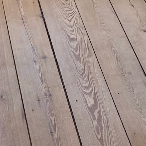 Brugt trægulv bestående af massive brædder fra 1906. Brædderne fremstår med patineret overflade og synlig træstruktur. Bredden er 14 cm.