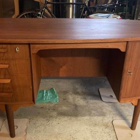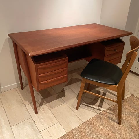 Fritstående skrivebord i teaktræ fra Omann Junior, model 76. Klassisk dansk design med flot håndværk og mange fine detaljer.