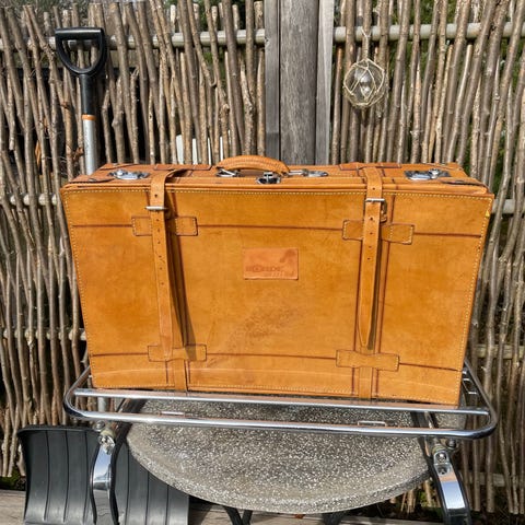 Antik kuffert med læder, træ og metalbeslag