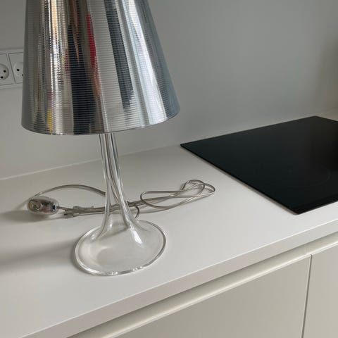 Flos gulvlampe designet af Philippe Starck. Lampen har en rund fod og slank stander i metal med en transparent, riflet skærm i plast, der giver et diffust og behageligt lys. Klassisk, opretstående gulvlampe velegnet til stue, læsehjørne eller andre opholdsrum, hvor der ønskes generel rumbelysning eller stemningslys.