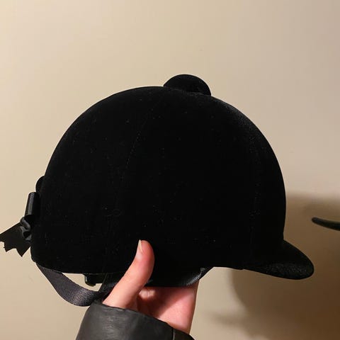Ridehjelm i sort med fast skygge og ventilationsdetalje i fronten. Indersiden har polstret foring og justerbar hagerem med klikspænde. Velegnet til ridning, hvor der ønskes hovedbeskyttelse med skygge og ventilation. Mærke og størrelse fremgår ikke tydeligt af billederne.