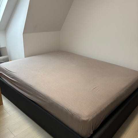 seng med gavl og opbevaring, polstret i lys tekstil. Sengen har høj, quiltet sengegavl og madras med topmadras. Sengens bund kan løftes op og giver et stort opbevaringsrum under madrassen, egnet til fx kufferter, sengetøj eller andre genstande. Velegnet som dobbeltseng i soveværelse eller gæsteværelse.