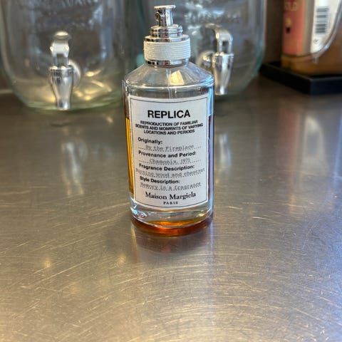 Maison Margiela Replica parfume. Flakon med spraydyse. Duft fra Replica-serien, egnet som unisex parfume. Klar glasflaske med etiket på forsiden og gennemsigtig hætte.