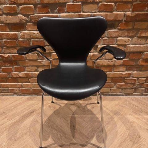 AJ, Syver, Syveren, 7er, 7-eren, Armstol, Spisebordsstol, Dansk Design, Danish Modern, Fritz Hansen, FH, 3107, Læderstol, Skind, Patina, Klassiker, Arkitekttegnet, Armlæn, Fuldpolstret.