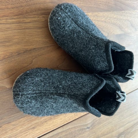Hjemmeskoene har en praktisk bund med et skridsikkert mønster under bunden, der sørger for et godt fodfæste.