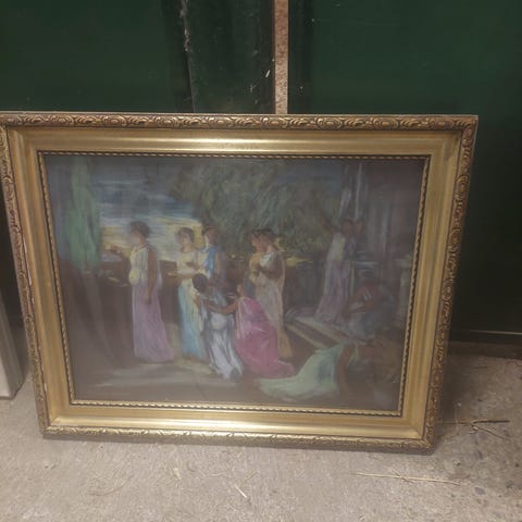 Billede med kvinde og barn og måske Bacchus i baggrunden. Guldramme med mindre afslag. Størrelse med ramme ca. 39 x 47 cm
