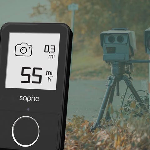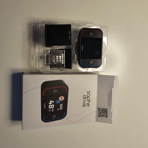 Saphe trafikalarm. Enheden bruges sammen med en Saphe appen til at advare om blandt andet fartkontroller og hændelser i trafikken via Saphe-appen. Velegnet til montering i mc hjelm som ekstra hjælp til opmærksomhed i trafikken.