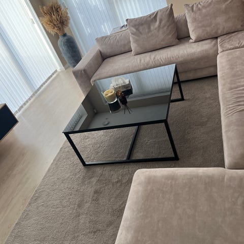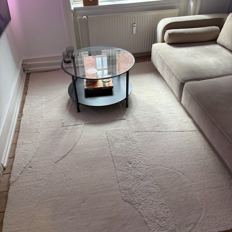 Ellos tæppe i naturfarvet / greysh, vævet struktur med frynser i enderne. Tæppet har et groft, tekstureret mønster og rektangulær form, velegnet til brug i stue, soveværelse eller andre opholdsrum. Materialet fremstår som et kraftigt, fladvævet tekstil, der ligger plant på gulvet og giver et neutralt, roligt udtryk i indretningen. Måler 140 x 200 (210 med frynser). Aldrig brugt. Fejlkøb - udelukkende pga størrelse. Det er rigtig flot. Nypris 1499kr. Købt på tilbud for 884kr.