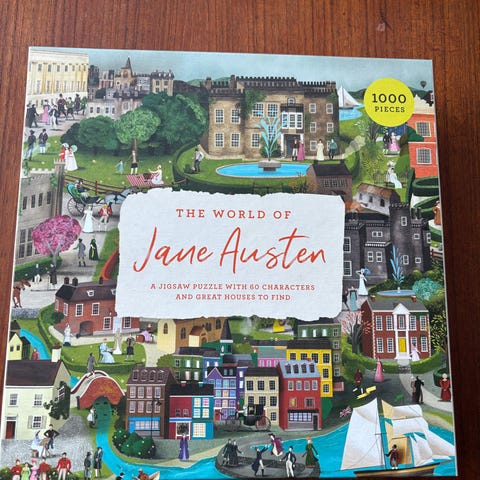 The World of Jane Austen puslespil med 1000 brikker. Motivet viser et illustreret univers inspireret af Jane Austens værker og omgivelser. Egnet til voksne og større børn, der kan lide litteraturrelaterede motiver og puslespil med mange brikker.