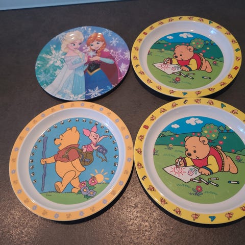 Sælger forskellige børnetallerkener lavet af bambusplast. Perfekte til små børn – lette, robuste og nemme at håndtere. Ideelle til både hverdag og måltider på farten.