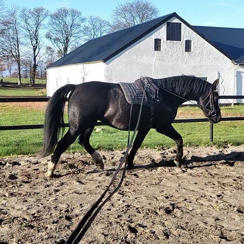 Hun er indimellem sine føl gjort ryttervant og er d. 1/2-26 påbegyndt tilridning hos mig, som arbejder professionelt med heste. Hun trænes med R+ principper for øje. Galina har allerede både været på skridttur ud i det blå, i ridehus og på bane.
