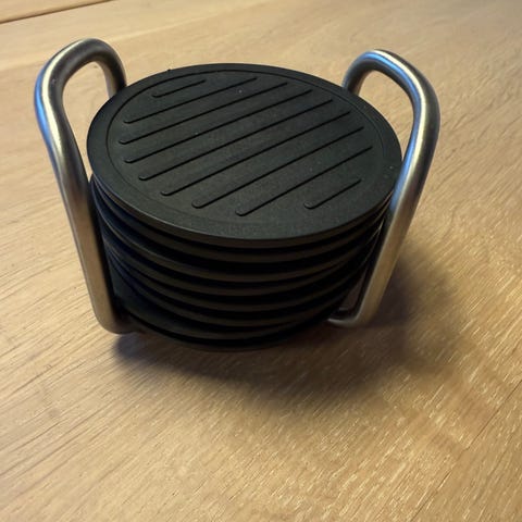 Teak coasters/glasbrikker fra Trip Trap på praktisk holder. 6 styks i god stand