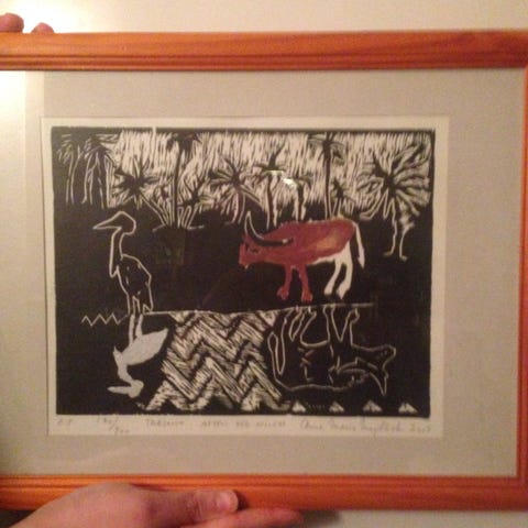 Træsnit i sort træindramning med fiskere. Sat i passepartout. Mindre pletter på træsnittet - se fotos.