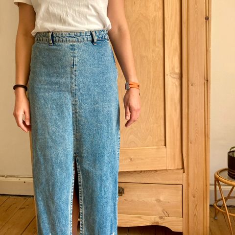 Zara lang denim nederdel i blå denim, str. M. Nederdelen er fremstillet i denim og har klassisk jeans-look med fem lommer og knaplukning foran. Længere model egnet til hverdagsbrug. Velegnet til kvinder, der ønsker en enkel og funktionel denimnederdel. Brugt - men i god stang. Fra dyre- og røgfrit hjem. Kan afhentes i Brøndbyvester, eller sendes for købers regning. Følg min profil - køb flere stk. og spar porto.