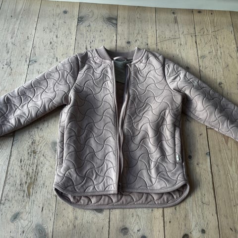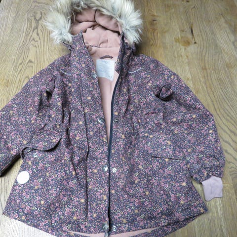 Wheat jakke til pige i str. 98. Jakken er lilla. Modellen har hætte med aftagelig pelskant, gennemgående lynlås med trykknapper foran samt to forlommer.