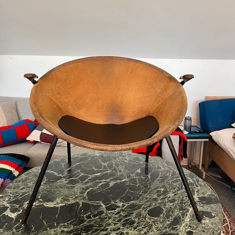 Den fineste lille loungestol i Oregon pine og snorebånd, i stil med Poul kjærholm og Jørgen høj