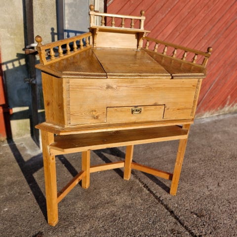 Solid skrivepult i massiv bejdset fyrtræ med lem og skuffe.