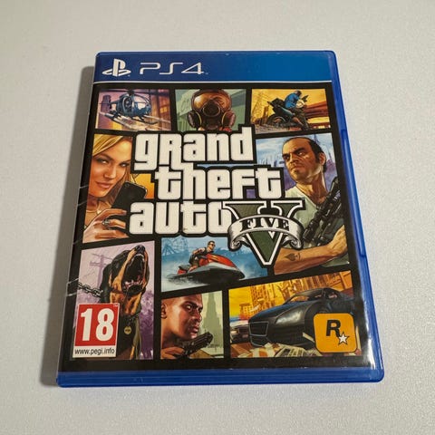 Rockstar Games Grand Theft Auto V PS4 spil. Fysisk udgave i blå PS4-plastikcover med spil-disk og trykt kort/indsats. Spillet er til PlayStation 4