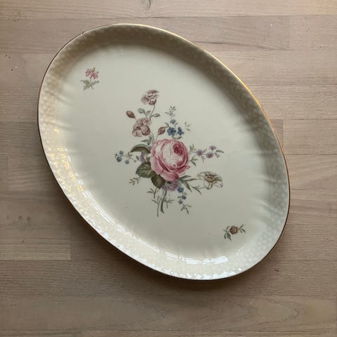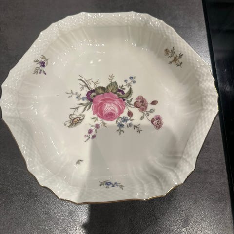 Et sekskantet fad i Royal Copenhagens "Frijsenborg" mønster. Fadet er lavet af porcelæn og har en bølget, sekskantet form. Det er cremefarvet og dekoreret med et håndmalet blomstermotiv, hvor en stor lyserød rose er central. Mønsteret er kendt for sit detaljerede, håndmalede håndværk. "Frijsenborg" (også stavet "Frisenborg") er et anerkendt og samlerobjekt fra Royal Copenhagen.