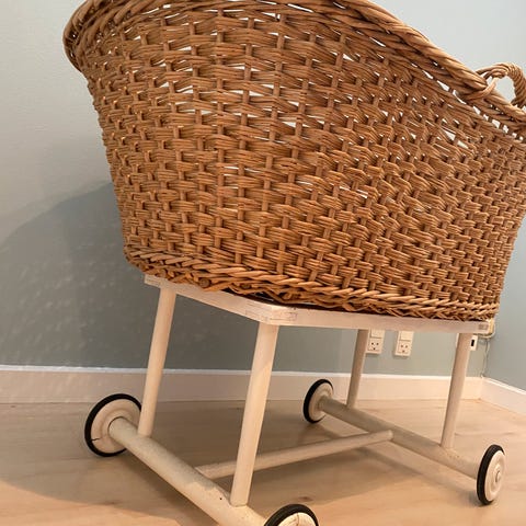 Vuggen er malet hvid. Fyldning på to sider er malet lyserød og på de to øvrige sider lyseblå.