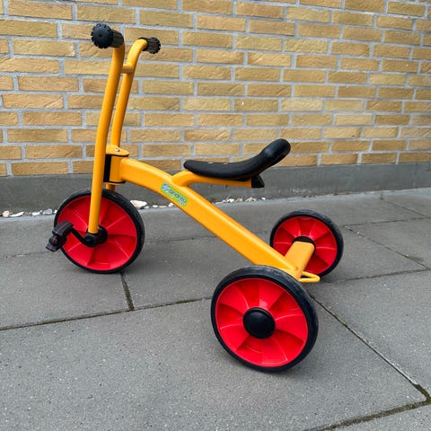 Trehjulet cykel med et aftageligt forældrehåndtag til børn fra 2 til 5 år i rigtigt fint stand.