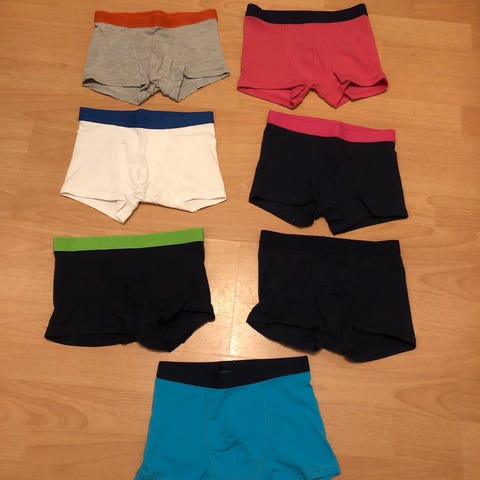 3 helt nye par underbukser sælges . De er aldrig brugt - aldrig vasket . De er i str 122-128 . Min søn er vokset fra dem . De sælges samlet for 40kr