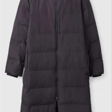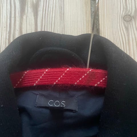 COS jakke til kvinder i størrelse 34 / XS eller S. Jakken er sort og fremstillet i polyester. Modellen er lang og vatteret med hætte og lukkes med knapper foran. Velegnet som yderjakke i køligere vejr. Materiale- og vaskeinformation fremgår af indvendige mærker.