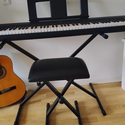 Technics digital piano i sort kabinet. Fuldt klaviatur med vægtede tangenter og indbygget stativ. Egnet til både øvebrug derhjemme og brug i øvelokale eller studie. Tilslutning via strøm og mulighed for brug med hovedtelefoner og eksterne lydkilder afhængigt af modelens tilslutninger.