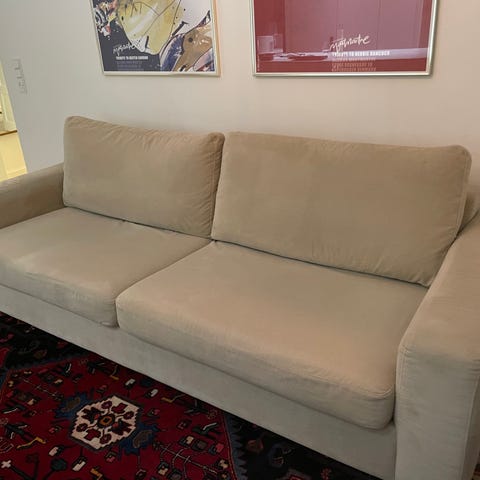 Bolia sofa i gråt tekstilbetræk. Sofaen har to sædehynder og to ryghynder samt armlæn i begge sider. Benene er slanke og mørke, hvilket giver et let udtryk. Sofaen egner sig til stue eller mindre opholdsrum som siddeplads til flere personer. Materiale og farve gør den anvendelig i mange typer indretning.