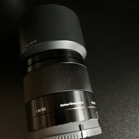 Sony mødlysblænde, foran og bag dæksler og 49mm UV filter følgermed.
