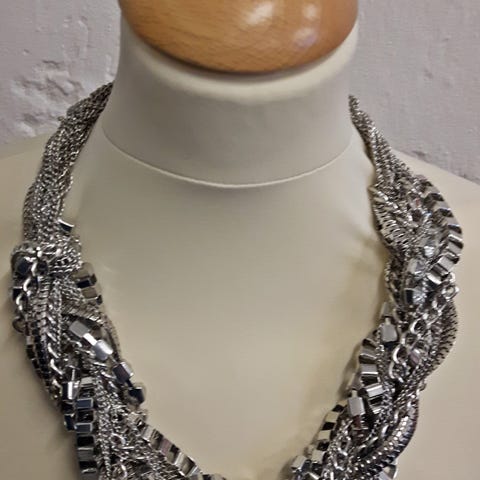 Den første halskæde, er elegant med forskellige størrelser sten i flere former. Der både sorte og klare sten/perler.