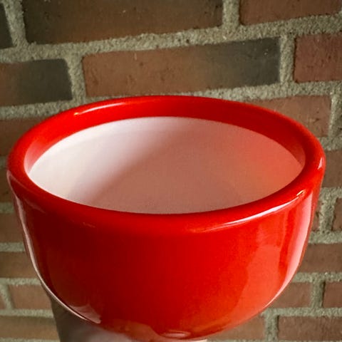 Beholderen er rund med en glat, skinnende overflade. Den er fremstillet af plast i en lys gul farve.