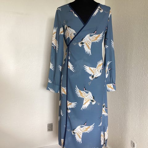 Kjolen har lange ærmer, dyb V-udskæring og en volang detalje langs kanten. Den er prydet med hvide prikker.,Afhentes i:,Røde Kors Holstebro (661),Bemærk at mail, chat og beskeder ikke besvares, og varen skal købes på knappen "Gå til varen"