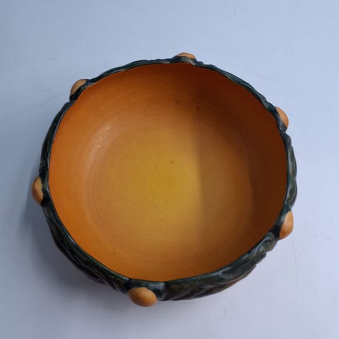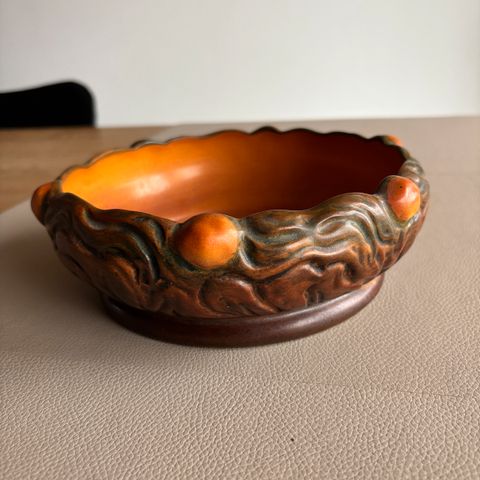 Skålen har en skulpturel form med bølgede kanter og tre fyldige knopper. Den er lavet af keramik og har en glat overflade. Indersiden er orange, mens kanten er dekoreret i en mørkere nuance.,Afhentes i:,Røde Kors Aabenraa (546),Bemærk at mail, chat og beskeder ikke besvares, og varen skal købes på knappen "Gå til varen"