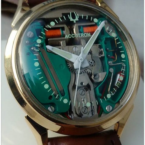 Skeletbevægelsen og spolerne er tydeligt synlige gennem krystallen, sekunderhåndens er hvid, og de hvide visere for timer og minutter er oplyst. Den buede krystal har et Accutron-logo.
