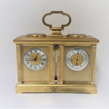 Vintage nautiske ure i mahogni-træ i sammensætning af termometer, hygrometer og barometer. Aneroide barostar af fransk oprindelse i bronceret finish og hjørner, testet og i funktion. Deres tilstand er meget god trods sin alder; velbevaret. Den bagerste del justeres efter land, og det kan installeres både vandret og lodret. Vedlagt er et bredt fotodokumentation til vurdering af det præsenterede; der vil blive anvendt særlig emballage for at undgå brud. Forsendelser uden for Den Europæiske Union eller Europa og uafhængige ikke er indeholdt i forsendelsespriserne ikke dækket af Catawiki og medfører et ekstra