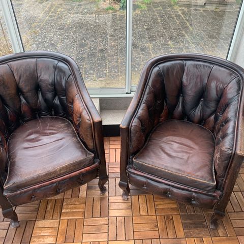 Et par lænestole i engelsk stil med Chesterfield- og rustik smag.