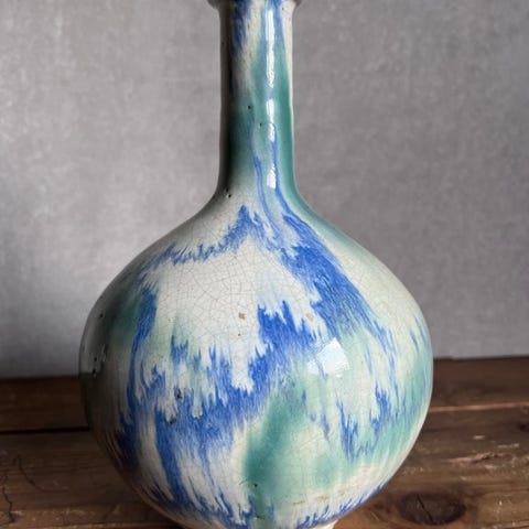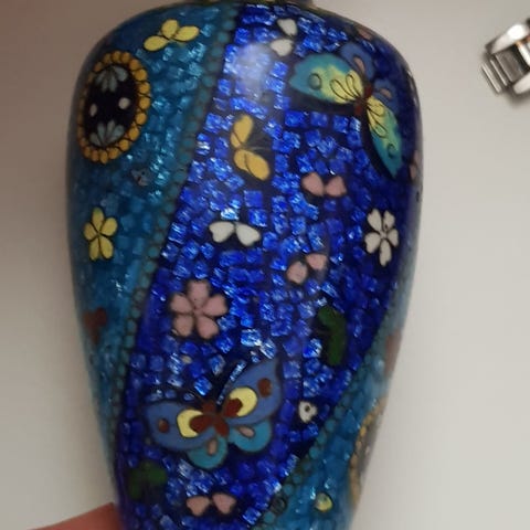 Japansk kobber cloisonné vase fra Meiji-perioden, mørk blå iris-motiv, 7,5 cm bred og 31 cm høj (dybde 31 cm), vægt 1 kg, i fremragende stand med kun få brugsspor. Klik på den blå "gå til varen" knap, for at købe eller byde på denne vare. Den samlede pris vil blive vist inden du afgiver dit bud.