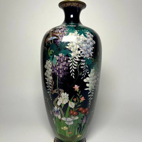 japansk cloisonné vase i mørk blå med irisblomst fra det 19. århundrede