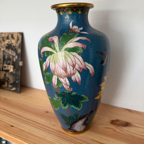 Vasen har en natblå baggrund med dekorationer af blomster og fugle i forskellige nuancer, udsmykket på en overlegen måde.