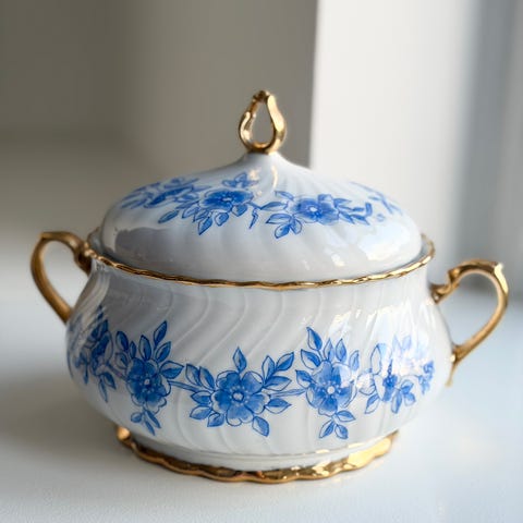 Meget gammel skål med låg. Desværre ikke i perfekt stand, da den har et skår i låget. Men meget dekorativ, og rigtig fin, hvis du skal dække et klassisk bord. Kan bruges til suppe eller måske kartofler - ved ikke helt hvordan de oprindelig blev brugt, men har en svaghed for dem, for de er bare så fine 🙈🫶🏻