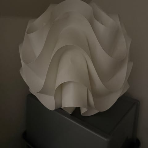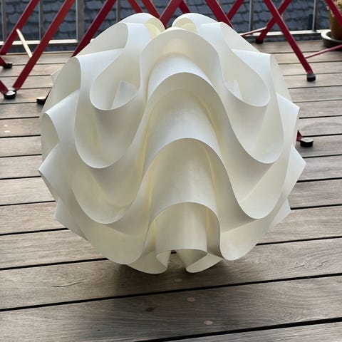 Le Klint loftlampe i hvid. Lampen har et skulpturelt, bølget skærm-design, der giver et diffust og behageligt lys. Velegnet som pendel over spisebord, i stue eller soveværelse. Klassisk dansk designlampe til ophæng i loft med ledning.