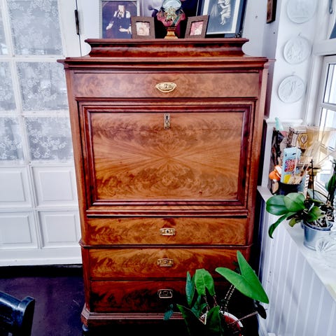 Fransk skrivekommode med klap og skuffer i lys træfarve