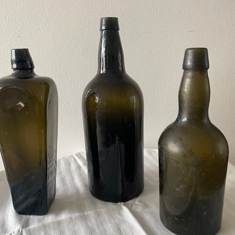 Begge flasker fremstår i fin brugt stand uden skår. Den mindste flaske har lidt striber/belægninger på indvendig side, og den største flaske har lidt belægning på den indvendige bund.