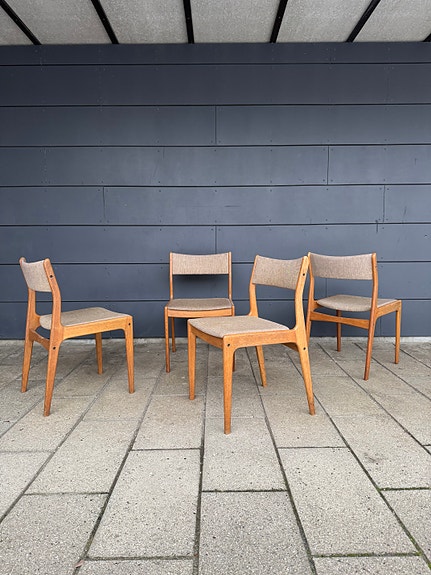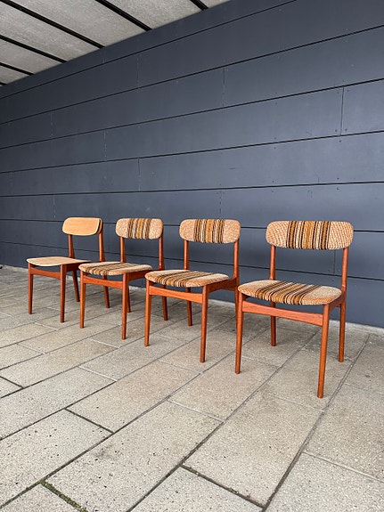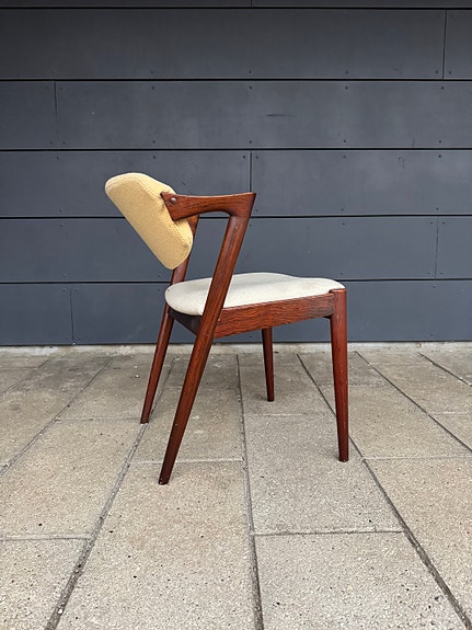 Nyere polstring. Et par åbne sygninger. En smule løs ved armlæn i den ene side.