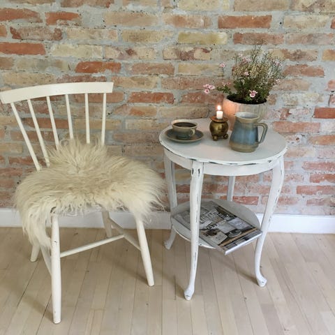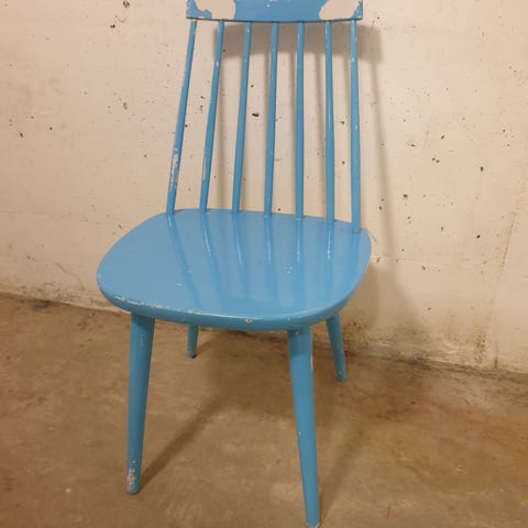 Gammel Spisebord stol i mørke grå og flet sæde 200. FDB klassisk hvid tremmestol design a Poul Volther 400kr.