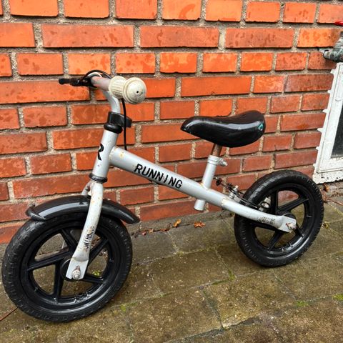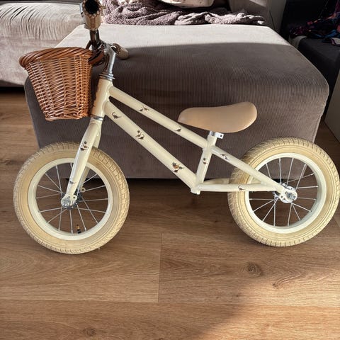 løbecykel med 12" hjul i grøn farve. Cyklen har lav indstigning, polstret saddel og styr med håndtag, som giver barnet mulighed for at øve balance og koordination. Velegnet som første cykel til mindre børn, før de skifter til almindelig cykel med pedaler.