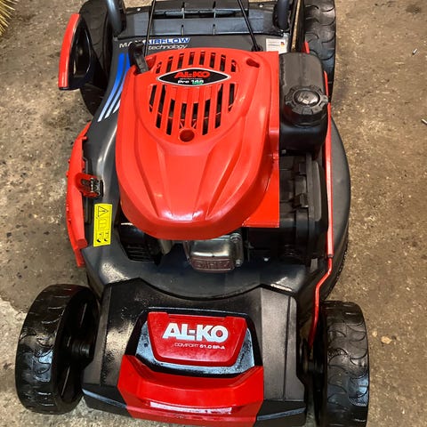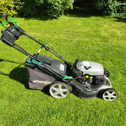 Benzindrevet plæneklipper med elstart og forhjulstræk